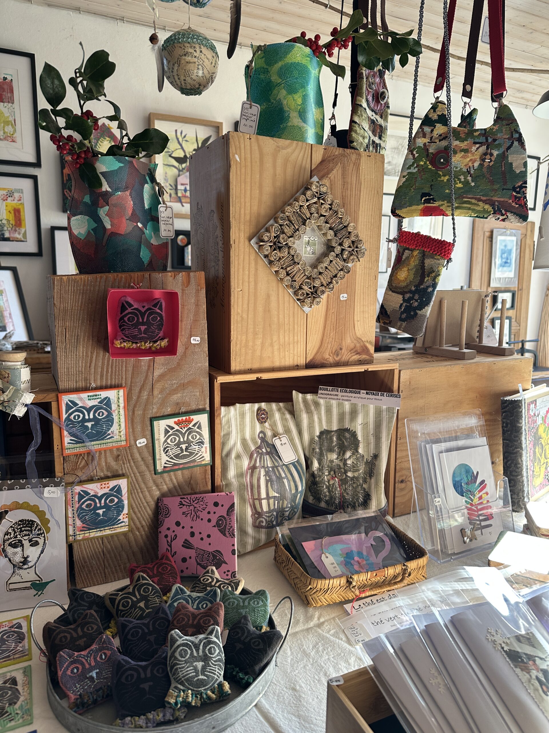 Mon atelier s’est habillé en mode boutique dans une atmosphère qui fleure bon les épices de Noël. Je vous accueille toutes les après-midi de 14h à 19h jusqu’à dimanche 21 décembre inclus. Créations en pièces uniques, faites à la main. Linogravure, estampes figuratives et abstraites imprimées à la main, papier et textile illustrés, carterie originale, albums customisés… Tout un monde à découvrir !