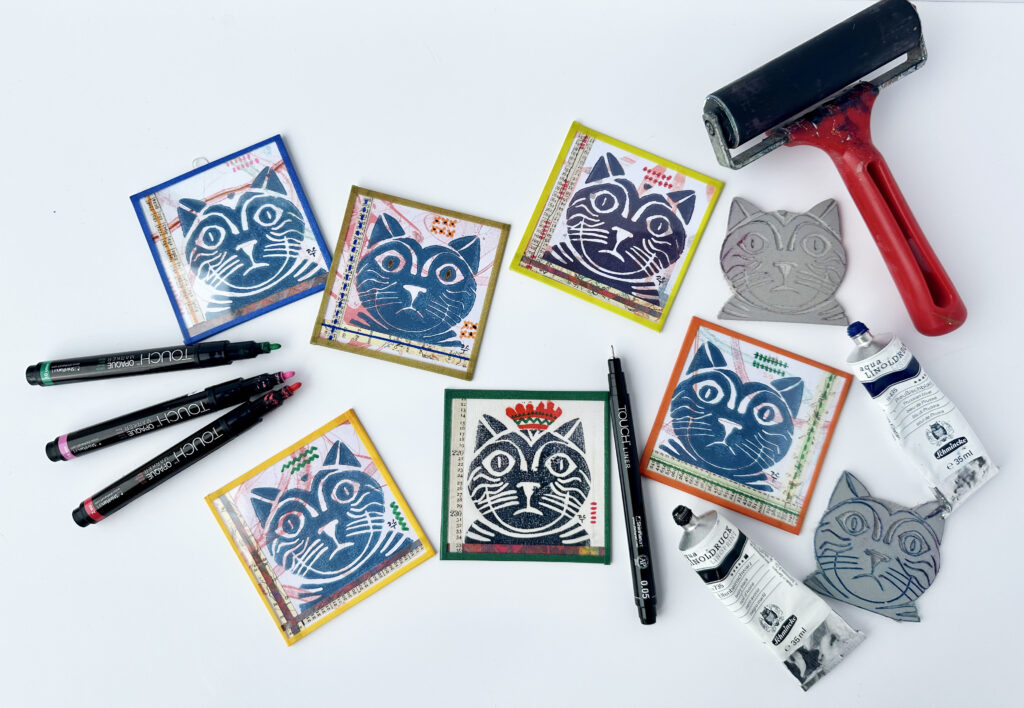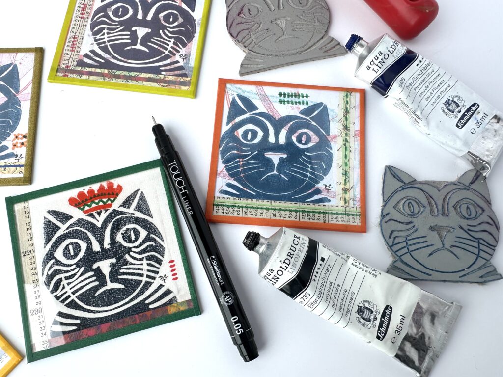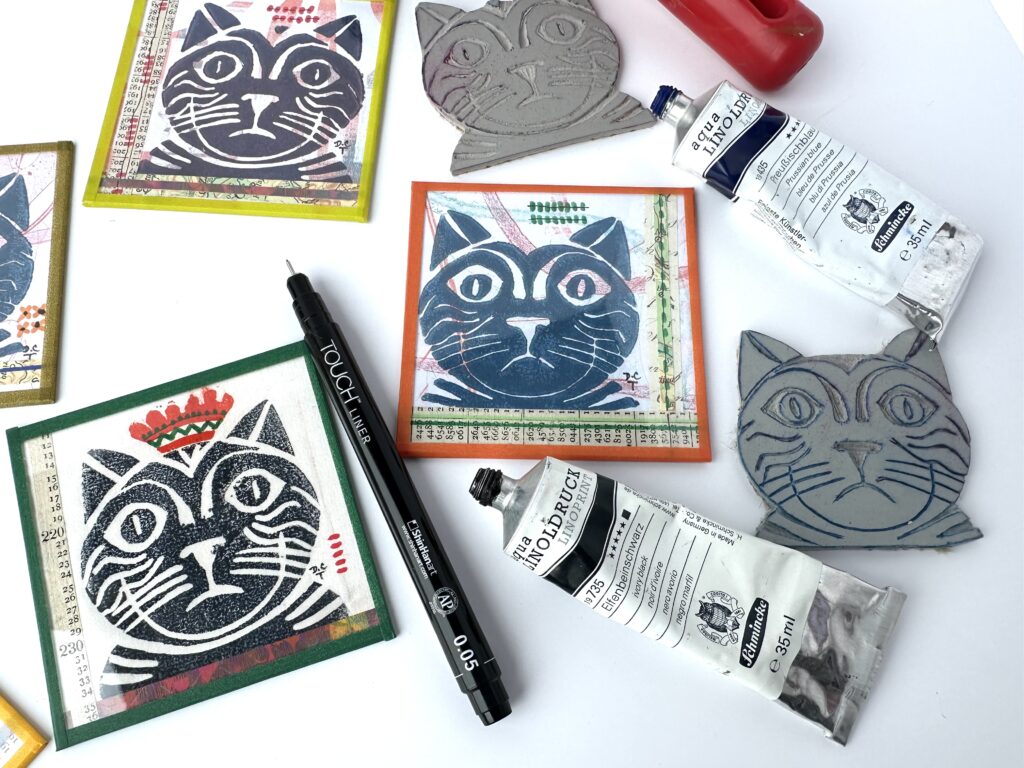 Avant de me remettre à l’eau forte, je refais de nouveaux dessins en linogravure. Le thème des chats m’est cher. D’autres modèles sont en cours…
